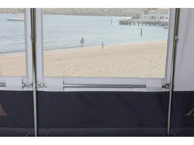 Deze unieke voortentluifel is speciaal ontwikkeld voor gebruik in het hele seizoen. Het materiaal voldoet aan dezelfde eisen die ook gesteld worden aan onze seizoenstenten. Duurzaam, afwasbaar en perfect strak af te spannen. De voortentluifel wordt met een speciale constructie onder de petluifel van de voortent bevestigd. Hierdoor sluit de voortentluifel perfect aan. Een mooie en stabiele constructie zorgt voor een comfortabele uitbreiding van de voortent. Deze voortentluifel biedt schaduw tijdens zonnige dagen maar ook bij regen biedt deze luifel een droog en luw onderkomen. Continue op – en afbreken is met deze seizoensluifel verleden tijd.