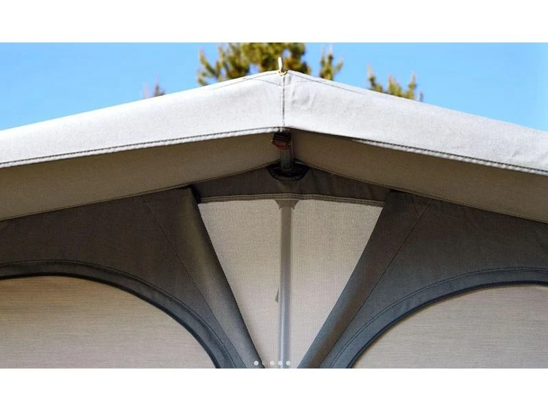 De wanden van ademend Isacryl zijn bijzonder kleurvast en zorgen samen met de vele ventilatie mogelijkheden voor een perfect binnenklimaat. De grote in panelen opgedeelde panoramavensters in het front maken de Ambassador tot en lichte en aangename voortent.