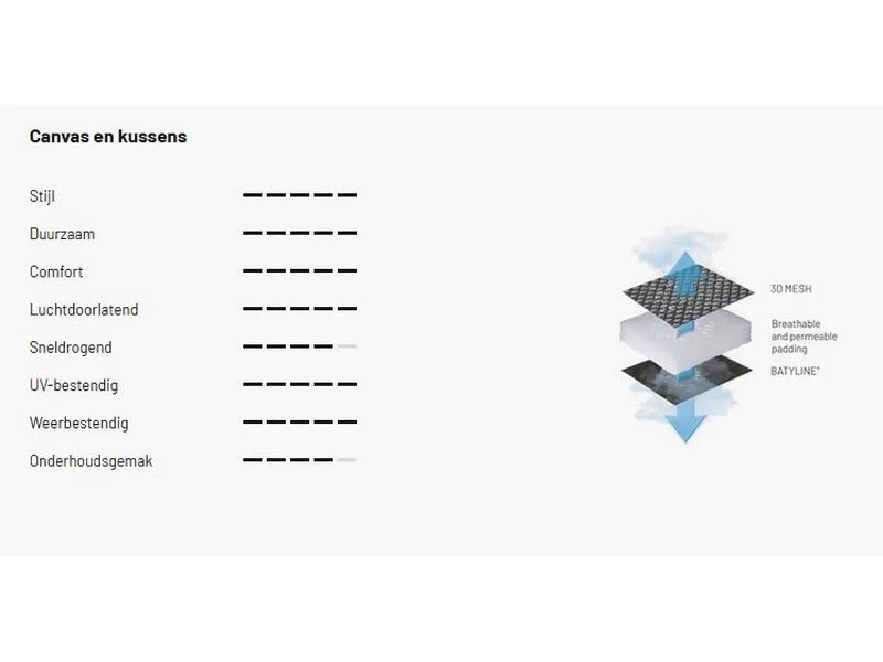 – BeComfort®-kussen: de drie lagen van dit kussen combineren ademende en waterdichte materialen, waardoor het niet alleen comfortabel is, maar tevens goed luchtdoorlatend en sneldrogend.