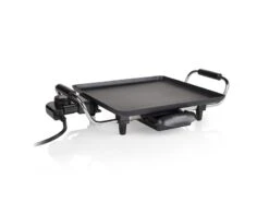 Compacte bakplaat (28 x 28 cm) speciaal geschikt voor op vakantie (800W). Met Cooltouch handgrepen voor gemakkelijk vastpakken, een instelbare temperatuur tot 250° C en handige vetopvangbak. Gezellige avonden gegarandeerd!